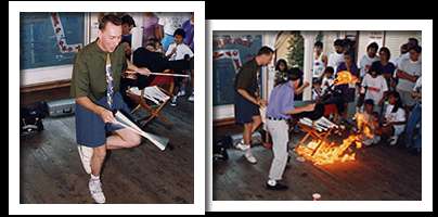 After Disneyland, his old friend and juggling student, David Deeble, and Randy became partners in a double act known as "Party of Two," or "The Dave & Randy Show" (depending on their mood). They performed together - up to 5 shows daily - in Long Beach, CA, on the boardwalk of Shoreline Village during the summer of '91. Since they weren't supposed to use real fire, David liked to draw a crowd by demonstrating his "cartoon fire" which, of course, wasn't real, and could never harm anyone.